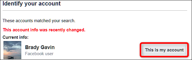 Если Facebook находит совпадение, оно отображается на экране результатов. Нажмите кнопку «Это моя учетная запись».