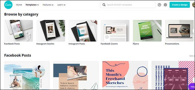 Чтобы выбрать шаблон, перейдите на главную страницу Canva. Отсюда вы можете использовать один из рекомендуемых шаблонов на домашней странице или навести курсор на кнопку «Шаблоны» в строке меню. В меню вы найдете множество типов макетов, сгруппированных по использованию.