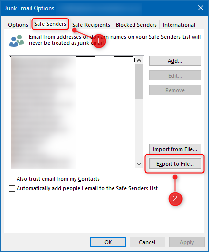 Вам нужно будет отдельно экспортировать надежных отправителей и заблокированных отправителей. Откройте вкладку «Надежные отправители» и нажмите «Экспорт в файл».